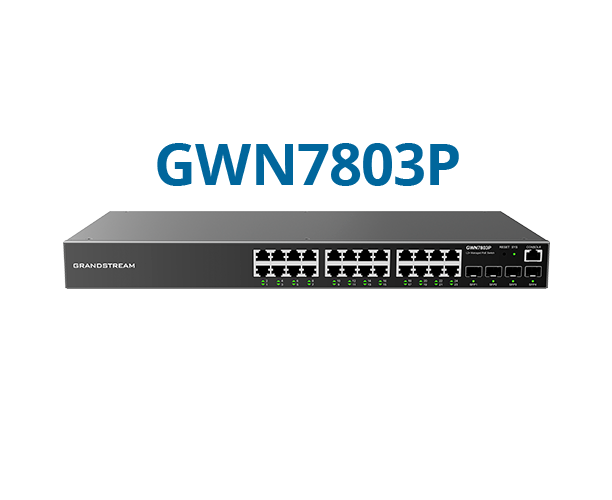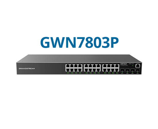 Grandstream GWN7803P — корпоративный управляемый коммутатор уровня Layer 2+ с PoE/PoE+ для офисов, магазинов, гостиниц, складов и объектов видеонаблюдения. Оснащён 24 гигабитными портами с PoE для питания IP-камер, Wi-Fi точек доступа и VoIP-телефонов, а также 4 SFP uplink для магистрали. Поддерживает расширенные VLAN, QoS, IGMP Snooping и комплексные функции безопасности; управляется через локальный Web-интерфейс, GDMS Networking (облако) и GWN Manager (on-premise).