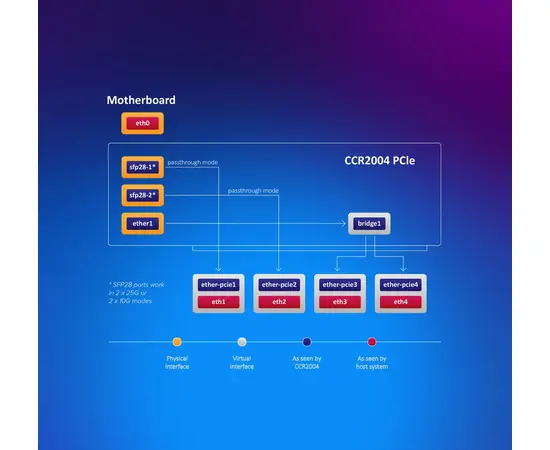 MikroTik CCR2004-1G-2XS-PCIe — это smart PCIe сетевая карта с полноценными возможностями маршрутизатора на базе RouterOS v7. Устройство объединяет производительную платформу ARM 64bit, 2 порта 25G SFP28 и 1 гигабитный Ethernet-порт управления в формате PCIe-карты для установки прямо в сервер.