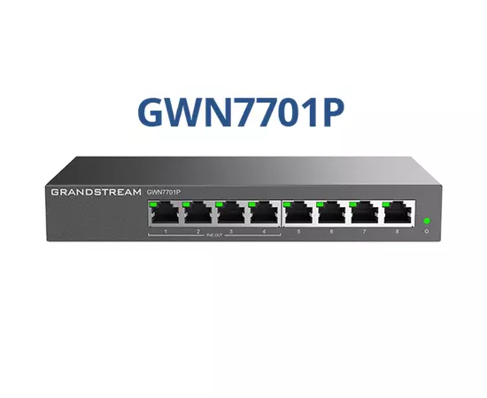 GWN7701P — неуправляемый «plug-and-play» коммутатор для быстрой и экономичной гигабитной связности в SOHO и SMB. 4 порта PoE+ (802.3af/at, до 30 Вт на порт, суммарный бюджет 60 Вт) позволяют питать IP-телефоны, камеры и точки доступа. Металлический корпус, настольный/настенный монтаж.