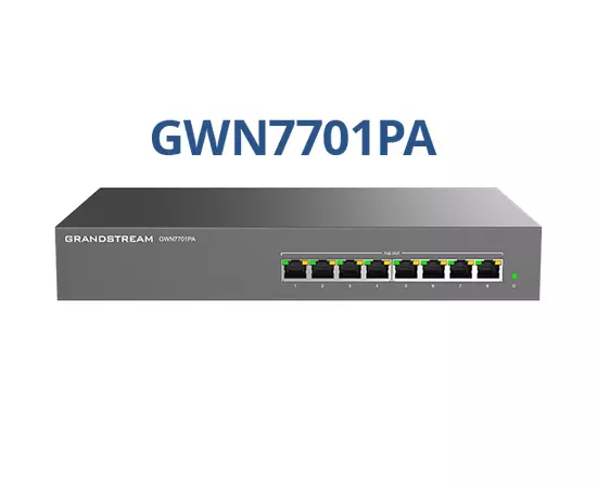 GWN7701PA — неуправляемый «plug-and-play» коммутатор для SOHO и SMB. Все 8 портов поддерживают PoE+ 802.3af/at (до 30 Вт на порт, суммарный бюджет 145 Вт), что позволяет напрямую питать IP-телефоны, камеры и точки доступа. Металлический корпус, настольный/стоечный монтаж, внутренний БП.
