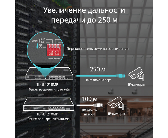 Благодаря режиму расширения дальность передачи PoE достигает 250 м** — идеально для размещения IP‑камер на большой территории.