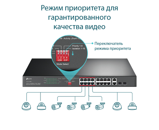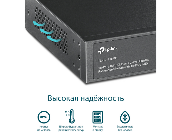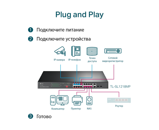 Благодаря соответствию стандарту PoE+ 802.3af/at каждый порт PoE поддерживает до 30 Вт, а общий бюджет PoE 250 Вт* для 16 портов PoE+ открывает широкий ряд возможностей, например, создание видеонаблюдения для офисов, общежитий и малого бизнеса. TL‑SL1218MP полностью совместим с IP‑камерами, точками доступа, IP‑телефонами, компьютерами, принтерами и не только.