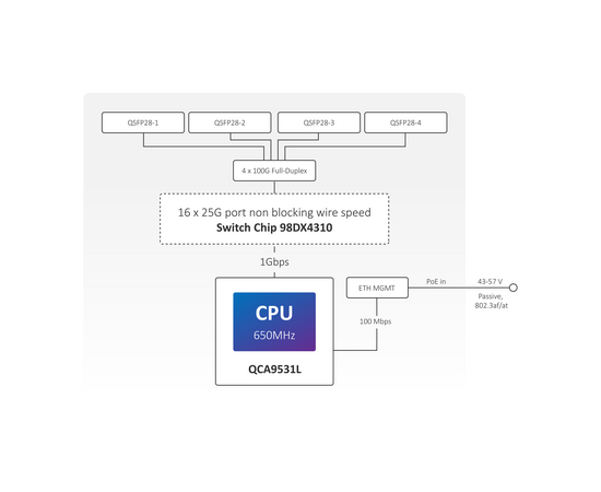 Устройство оснащено процессором QCA9531 650 GHz архитектуры MIPSBE. Роутер имеет 1 порт 10/100 Мбит/с (Fast Ethernet) и 4 порта QSFP28 (100 Гбит/c) для высокоскоростных оптических соединений, 64 МБ оперативной памяти, а также 16 МБ ПЗУ! Имеет резервный источник питания с возможностью горячей замены.