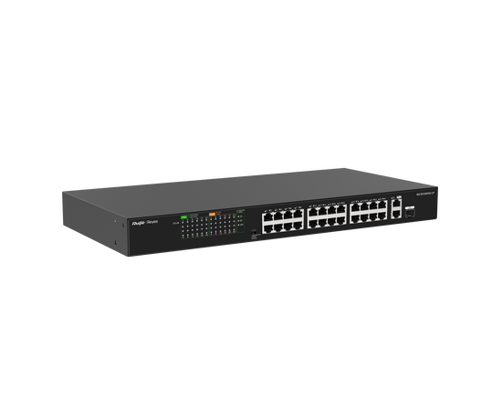 Модель оснащена 24 портами PoE+, двумя гигабитными uplink-портами, поддерживает Plug and Play, имеет общий PoE budget 180 Вт и функции PoE Watchdog и изоляции портов для более стабильной и безопасной работы сети. Коммутатор также отображается в Ruijie Cloud.