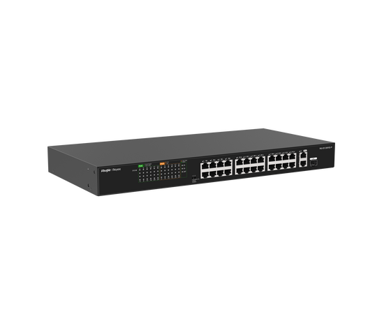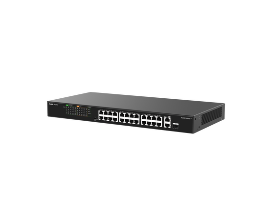 Модель оснащена 24 портами PoE+, двумя гигабитными uplink-портами, поддерживает Plug and Play, имеет высокий PoE budget 370 Вт и поддерживает интеллектуальное PoE-управление. Коммутатор также отображается в Ruijie Cloud, что удобно для мониторинга и обслуживания сети.