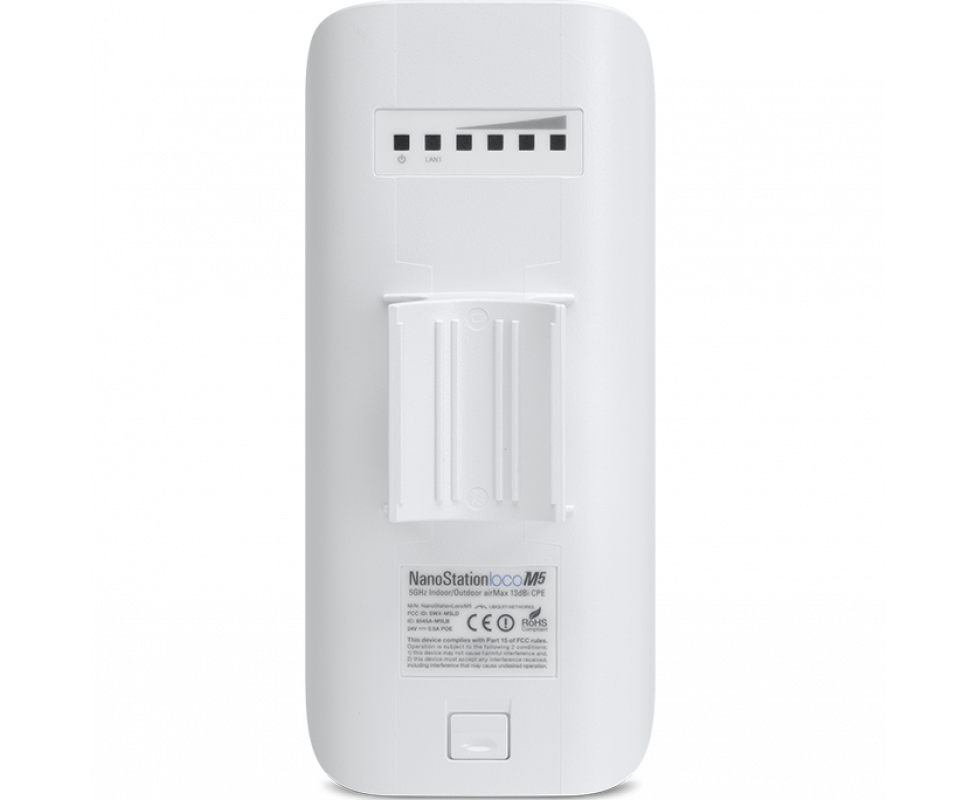 NanoStation M5 loco (LOCOM5) — компактная уличная точка доступа/клиент (CPE) диапазона 5 ГГц для построения радиомостов PtP и подключения абонентов в сетях PtMP. Оснащена интегрированной направленной антенной 13 dBi, поддерживает фирменный протокол airMAX (MIMO TDMA), питается по пассивному PoE 24 В (адаптер/инжектор в комплекте) и подходит для стабильных линков на дистанциях до нескольких километров (в зависимости от условий и стороны базовой станции).