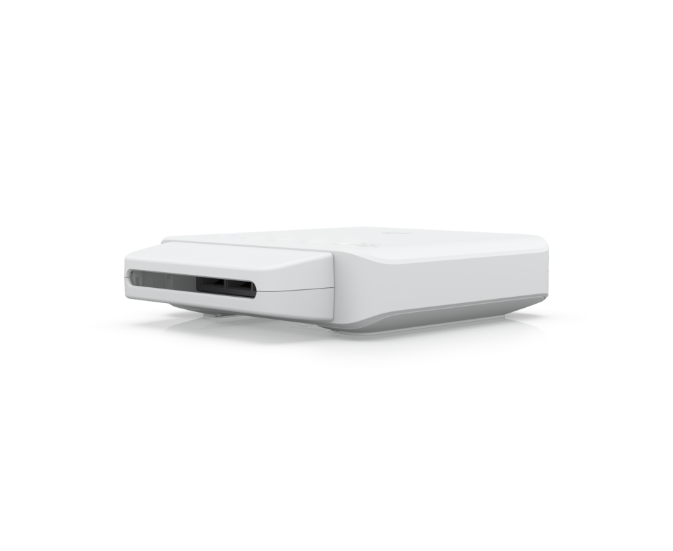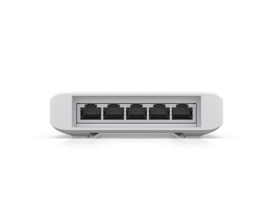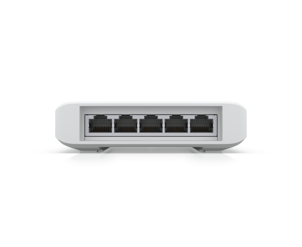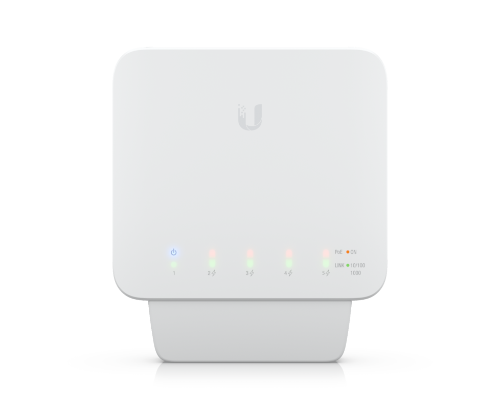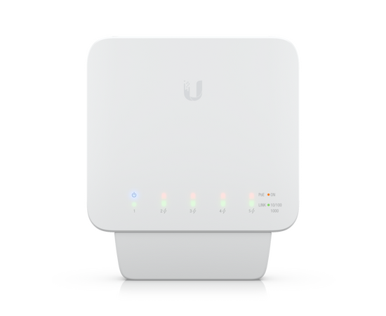 UniFi Switch Flex (USW-FLEX) — компактный управляемый L2 коммутатор для установки на улице и внутри помещений. Имеет 5 гигабитных портов RJ45, влагозащиту IP55 и гибкие варианты питания через PoE (802.3af/at/bt) или PoE-адаптер. Подходит для питания точек доступа и камер: раздаёт PoE на порты 2–5 (до 15.4 Вт на порт, общий бюджет зависит от источника питания).