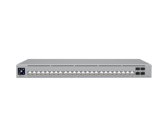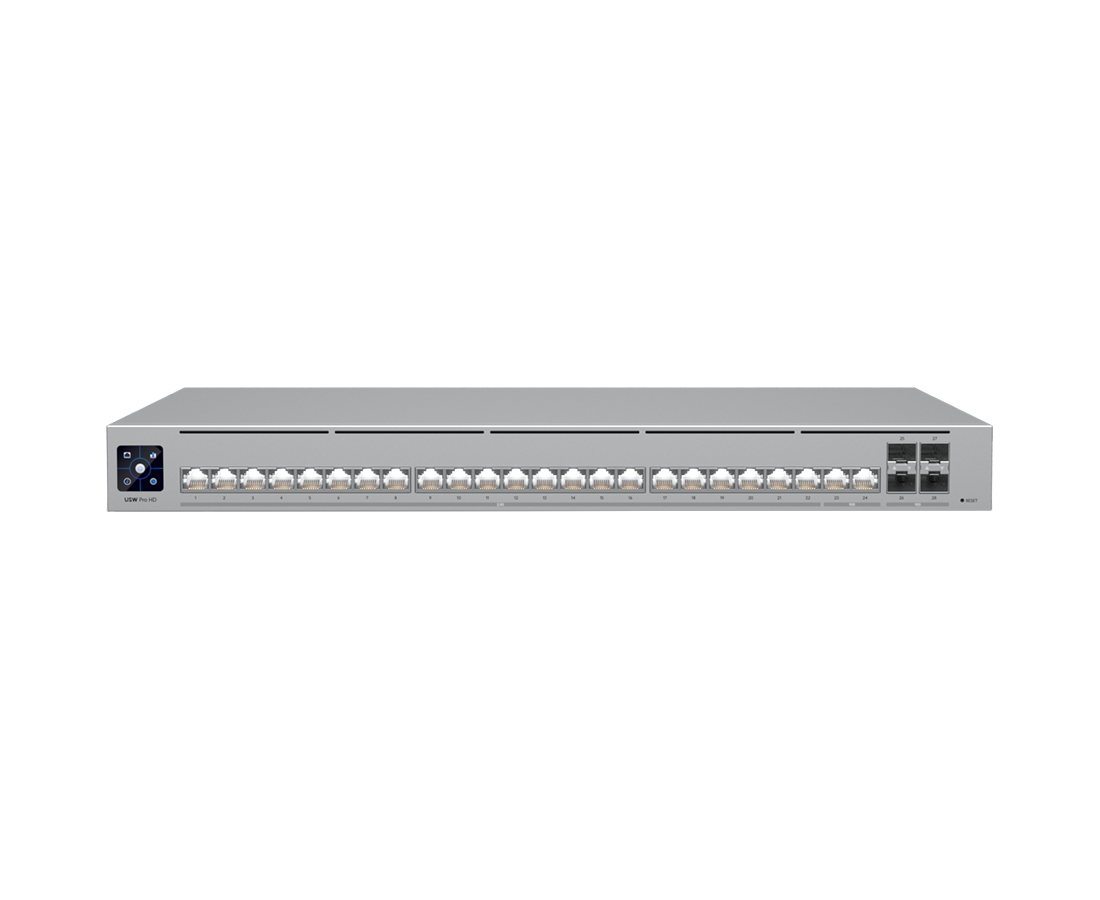 UniFi Switch Pro HD 24 PoE — профессиональный управляемый Layer 3 коммутатор для современной корпоративной сети, где важны высокая плотность PoE++, многогигабитные порты и 10G uplink. Модель объединяет 24 PoE++ порта, из которых 22 работают на 2.5 GbE RJ45, а ещё 2 — на 10 GbE RJ45, а также оснащена четырьмя портами 10G SFP+ для скоростного подключения к ядру сети и серверам.