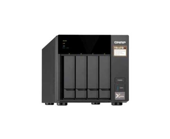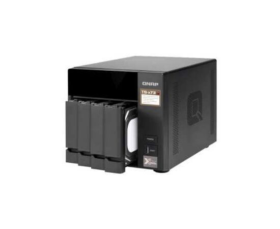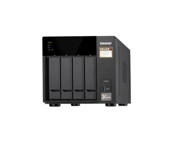 Данная модель оборудована 4 отсеками для установки накопителей типоразмера 3.5 и 2.5 дюйма. Отмечается, что объем каждого накопителя не должен превышать 12 ТБ. Наличие 4-х коннекторов LAN (пропускная способность 1 ГБ/с) предусматривает интеграцию в обслуживаемую сетевую инфраструктуру с разграничением доступа. Также хранилище (NAS) QNAP TS-473-4G имеет порты USB версии 3.0.