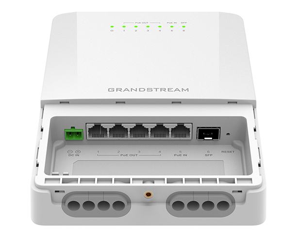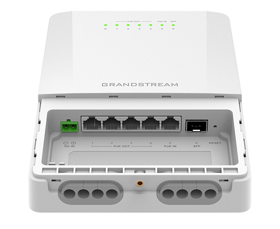 GWN7710R — 6 portli (5×GE RJ45 + 1×SFP 1/2,5 G) tashqi darajadagi L2 lite switch. 1–4-portlarda PoE chiqishi, 5-portda PoE kirishi mavjud; passiv 24/48 V DC qo‘llab-quvvatlanadi (1-portda 60 Vtgacha). Mahalliy veb-interfeys, GWN Manager va GDMS orqali boshqaruv; VLAN, QoS, IGMP Snooping, STP/RSTP va PoE Watchdog bilan barqaror ishlaydi.