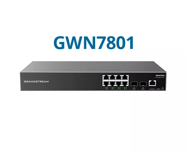 GWN7801 — SMB uchun korporativ Layer 2+ switch: 8 ta gigabit RJ45 va 2 ta 1G SFP port, non-blocking arxitektura, kengaytirilgan VLAN, QoS va xavfsizlik (ARP Inspection, IP Source Guard, DoS himoyasi, DHCP Snooping). Boshqaruv: mahalliy Web/CLI, shuningdek GDMS Networking va GWN Manager.