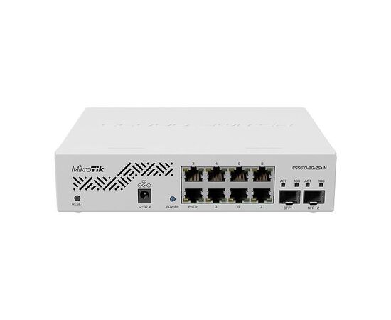 CSS610-8G-2S+IN – бюджетный настольный управляемый L3-коммутатор MikroTik с функциями маршрутизатора, работающий под управлением операционной системы SwOS. Имеет 10 независимых коммутационных портов: 8 Ethernet-портов 1 Гбит, с функциями авто определения, а также 2 SFP+ порта для оптических соединений.