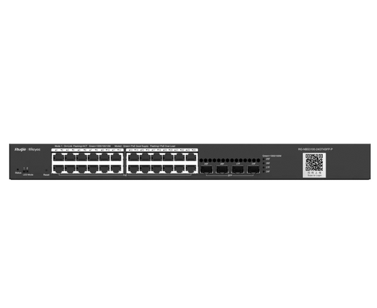 Reyee RG-NBS3100-24GT4SFP-P-V2 — bu 24 ta PoE Gigabit RJ45 port va 4 ta SFP uplink portga ega L2+ darajadagi boshqariladigan switch. Qurilma 370 Vtgacha umumiy PoE quvvatini qo‘llab-quvvatlaydi. IP-kameralar, Wi-Fi access point va VoIP qurilmalar bilan ishlash uchun ideal. Ruijie Cloud orqali masofadan boshqariladi, bu esa uni xavfsizlik, ta’lim va biznes loyihalari uchun qulay qiladi.