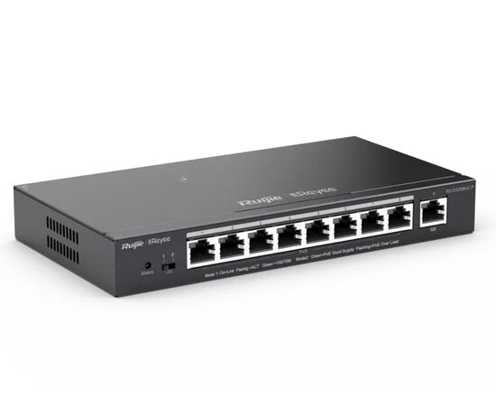 Reyee RG-ES209GC-P — bu 8 ta PoE RJ45 port va 1 ta Combo uplink portga (RJ45/SFP) ega boshqariladigan L2 switch. Qurilma 110 Vtgacha umumiy PoE quvvatini qo‘llab-quvvatlaydi. Kamera, Wi-Fi va VoIP uchun juda mos. Ruijie Cloud orqali boshqariladi, VLAN, QoS, avtomatik tiklash, loop aniqlash va tarmoq vizualizatsiyasini qo‘llab-quvvatlaydi.