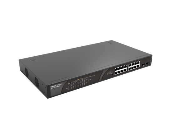 Reyee RG-ES118GS-P — bu 16 ta PoE RJ45 port va 2 ta uplink port (1 ta Combo RJ45/SFP va 1 ta SFP) ga ega L2 darajadagi boshqariladigan switch. Qurilma 230 Vtgacha umumiy PoE quvvatini taqdim etadi. IP-kameralar, Wi-Fi access point va VoIP qurilmalar bilan ishlash uchun mo‘ljallangan. Ruijie Cloud orqali boshqariladi, VLAN, QoS, loop aniqlash va kameralarni avtomatik qayta tiklash funksiyalarini qo‘llab-quvvatlaydi.
