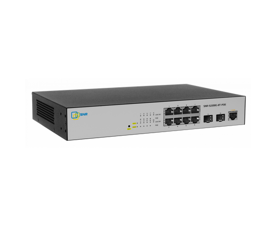 SNR-S2200G-8T-POE — Web Smart POE коммутатор, оснащенный 2 портами SFP 100/1000BaseX и 8 портами 10/100/1000BaseT с поддержкой POE IEEE802.3af/at. Суммарная мощность POE до 100W. Поддержка POE 802.3at/af на всех 8 портах позволяет питать IP/видео-телефоны, Wi-Fi-точки, тонкие клиенты напрямую от коммутатора, что уменьшает стоимость владения и упрощает обслуживание инфраструктуры, а наличие веб-интерфейса обеспечивает простоту и удобство конфигурации коммутатора.