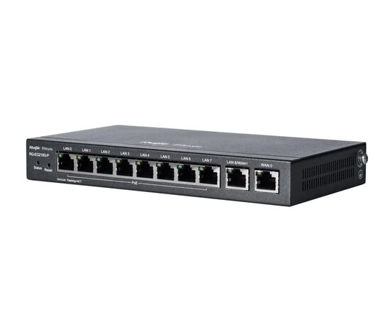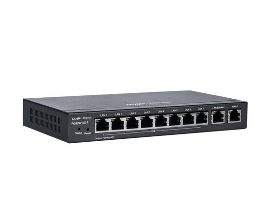 Reyee RG-EG210G-P-V3 — bu yangilangan PoE marshrutizator, 8 ta PoE GE port, 2 ta uplink port bilan jihozlangan va Cloud orqali boshqariladi. Qurilma 2 Gbit/s gacha NAT, VPN, QoS, DPI, VLAN funksiyalarini qo‘llab-quvvatlaydi. Shuningdek, bu model Wi-Fi access point va switchlarni markazlashgan boshqarish imkoniyatini beradi.
